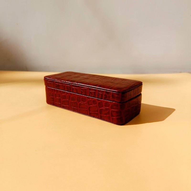 - Full-grain Soft One Touch Glove Tanned Nappa Leather with a luxurious Crocodile Texture in Deep Wine Red.
